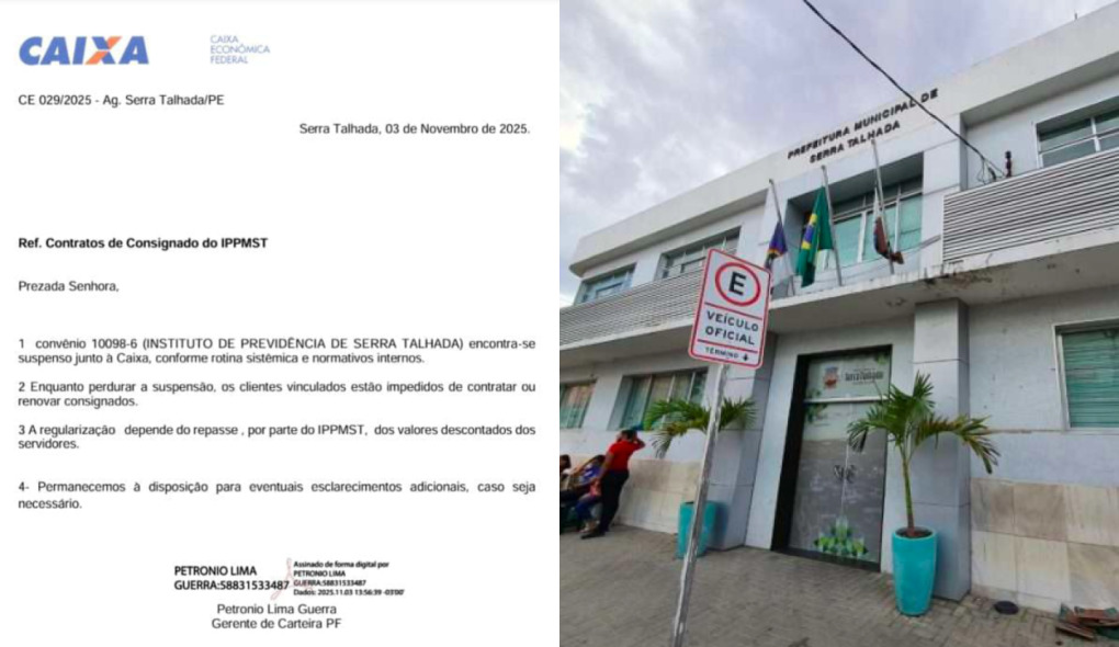 O Blog Júnior Campos teve acesso a um ofício da Caixa Econômica Federal, datado de 3 de novembro de 2025, pela agência de Serra Talhada/PE (CE 029/2025), que confirma a suspensão dos contratos de empréstimo consignado do Instituto de Previdência de Serra Talhada (IPPMST). Segundo o documento, o convênio 10098-6 encontra-se suspenso “conforme rotina sistêmica e normativos internos”, o que impede os servidores vinculados de contratar ou renovar consignados. A regularização, de acordo com a Caixa, depende do repasse dos valores descontados dos servidores pelo próprio IPPMST, permanecendo a instituição à disposição para esclarecimentos adicionais. O ofício é assinado pelo gerente de carteira PF, Petronio Lima Guerra.