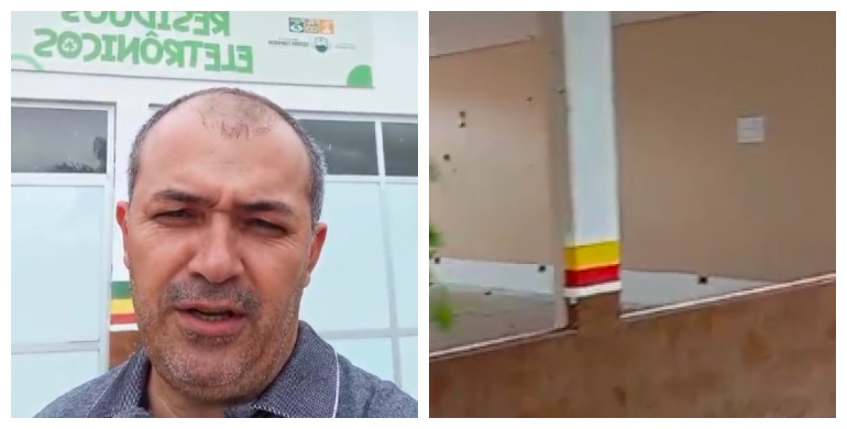 Em seguida, o ex-vereador mostra o equipamento pertencente à Prefeitura e relata os danos encontrados. “Esse equipamento aqui da Prefeitura está aqui jogado. Todo deteriorado, quebrado, quebraram, danificaram aqui, quebraram os vidros, tiraram as esquadrilhas, está tudo aberto aqui. Enfim, jogado à graça”, diz enquanto grava as imagens.