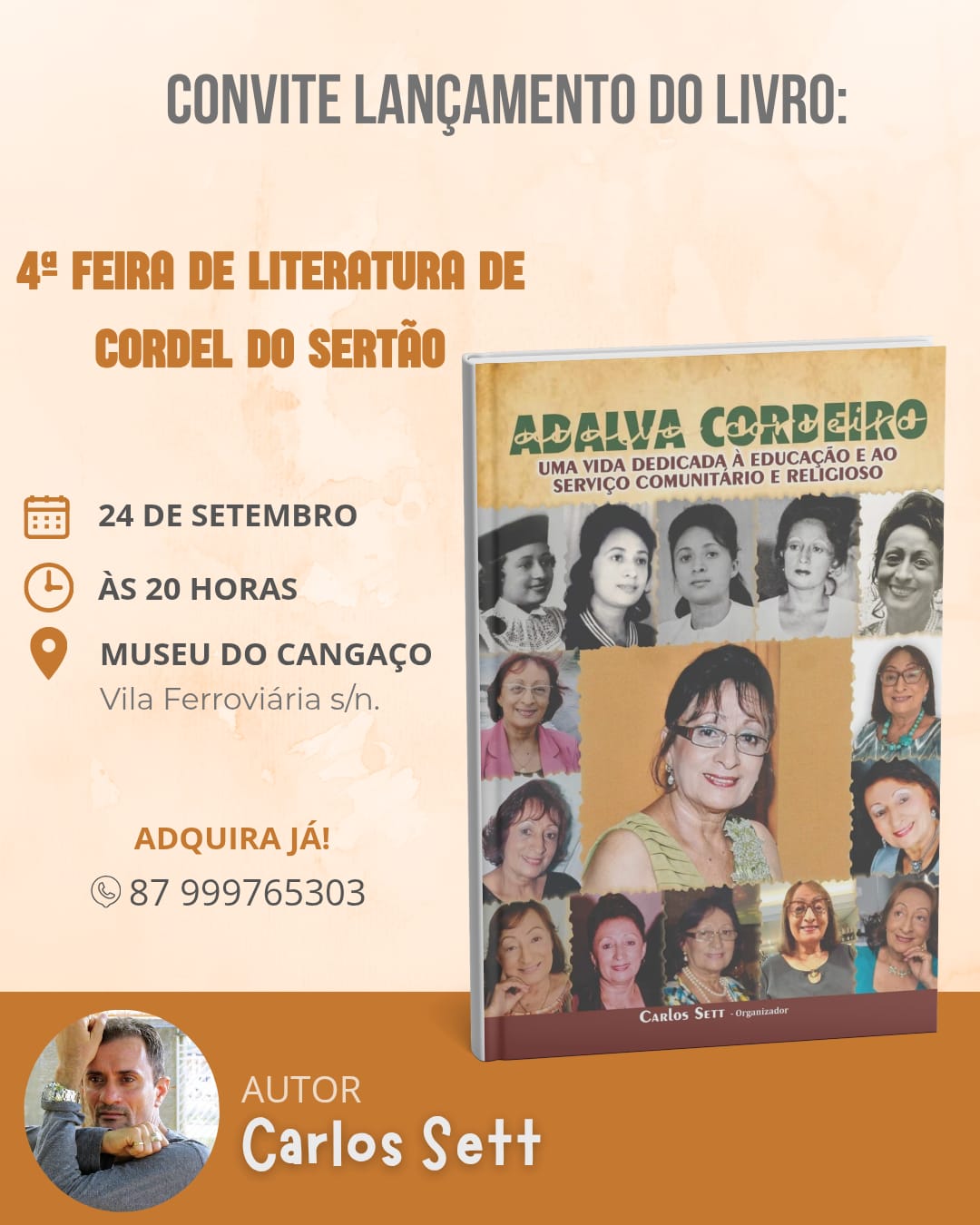 Carlos Sett, que é ator e escritor, é um dos mais expressivos artistas da Capital do Xaxado na atualidade, estando à frente do Ponto de Cultura ETEAST Produções Artísticas, desde sua fundação em 1999, lançará no evento 2 livros dos 5 já publicados em sua carreira de escritor. Trata-se das obras “Adalva Cordeiro: Uma Vida Dedicada à Educação e ao Serviço Comunitário e Religioso”, publicada em 2023 com uma nova tiragem e “Teatro Serra-talhadense: Um Século de História”.