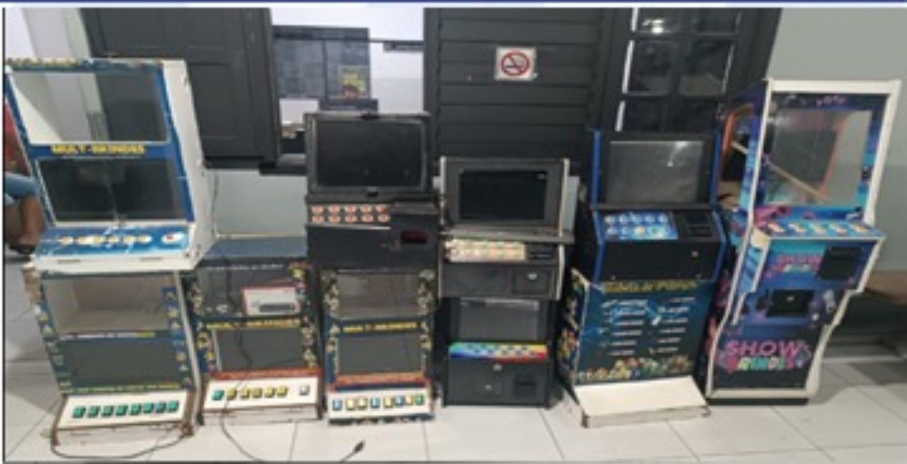 Ao chegarem ao endereço indicado, os policiais encontraram nove máquinas caça-níqueis em pleno funcionamento, além de uma mesa de jogos com fichas, baralhos e dinheiro vivo espalhado. Duas carteiras chamaram atenção: em uma delas havia R$ 410,00, e na outra, R$ 2.516,00 em diversas cédulas.