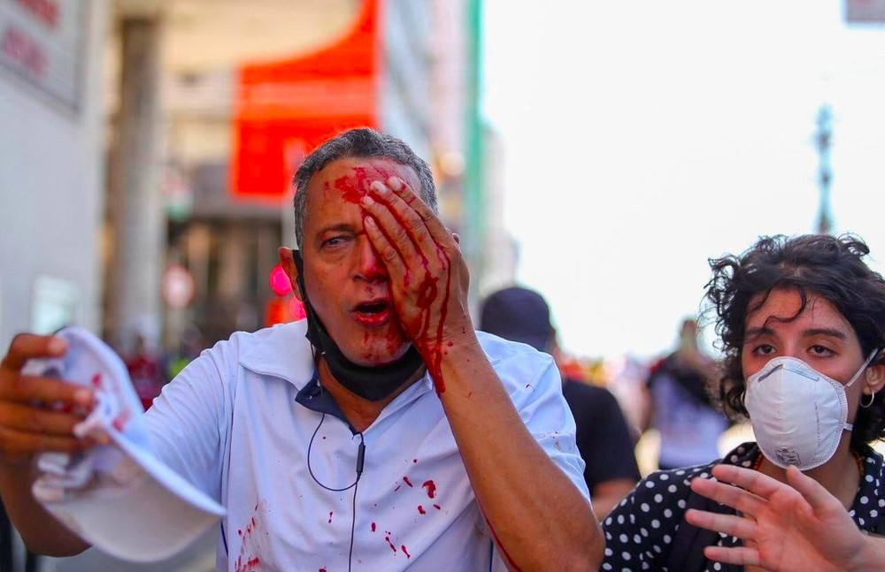 Daniel da Silva foi atingido no olho por bala de borracha atirada pela PM durante protesto contra Bolsonaro no Recife, no sábado (29) — Foto: Hugo Muniz